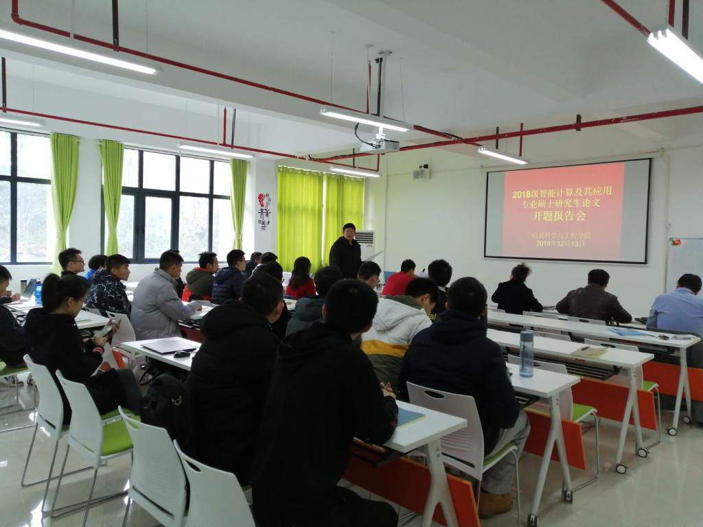 12月13日上午,信息科学与工程学院2018级智能计算及其应用硕士毕业论文开题报告会在工科实训大楼C315会议室召开。报告会由周小清教授主持,丁雷教授、莫礼平高级实验师、张仁民副教授、周恺卿博士等四位导师参与评审。