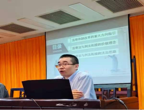 2021年5月24日,西南政法大学法学院教授、博士生导师、博士后合作导师、教育部人文社科重大攻关项目首席专家、巴渝学者特聘教授、重庆市新型犯罪研究中心执行主任陈伟教授应邀来我院,在模拟法庭开展主题为“监察法与刑法衔接的价值理念与法治思路”的学术讲座。此次讲座由魏风劲副院长主持,我院研究生及导师共同参与。