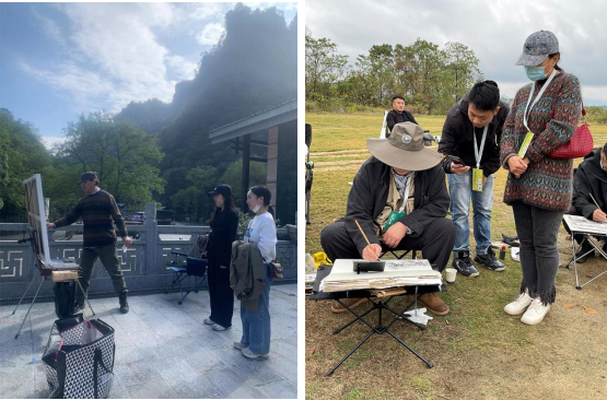 在吉首大学美术学院硕士生导师田爱华、郑泓灏、向妤的共同带领下,导师和研究生共同参与了美术名家写生活动,在此过程中,美术学院研究生认真观摩、互相交流,认真倾听名家创作过程中的思想,都表示受益匪浅,在专业方面取得了很大的提升与进步。