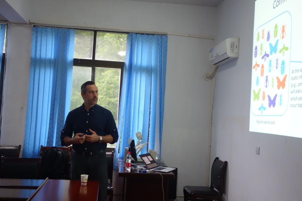 Marc Cadotte教授首先介绍了影响群落构建的两大因素:环境过滤和种间竞争。随后他结合自己多年的研究从时间演替和空间尺度上探讨了影响群落的内在机制,系统讲解了谱系多样性对于生态系统生产力、稳定性和可入侵性的影响,揭示了进化历史对于群落物种定殖、共存和灭绝的效应。最后,Marc Cadotte教授介绍了他的研究团队,他表明他对武陵山区的植被群落兴趣浓厚,希望加强多伦多大学与我校的学术交流。(文/杨胜香