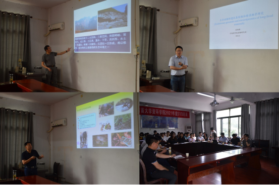 论坛伊始,彭清忠院长对三位教授的到来表示热烈欢迎,刘志霄教授介绍了三位专家的研究领域和主要学术成果,蒋万胜教授向三位教授介绍了我院动物生态学团队和科研概况。论坛中,李明研究员作了题为《石山叶猴适应喀斯特环境的遗传机制研究》的学术报告,介绍了石山叶猴在行为、生理和分子层面对喀斯特高钙环境的遗传适应机制,研究成果在灵长动物领域有很大的学术影响力。周旭明研究员作了题为《长寿动物的进化基因组与转录组学研究》的学术报告,他们团队从进化基因组学与转录组学的角度探究了长寿动物的适应性进化与衰老机制,取得了一系列高水平科研成果。向左甫教授作了《川金丝猴异亲哺乳行为演化》的学术报告,介绍了向教授团队围绕金丝猴族群构成,搜寻隐秘食物,雄性联盟、雌性异亲哺乳等行为开展的科研工作,以及取得的高水平学术成果。会后,三位教授围绕报告内容和和研究生升学等话题与在座的师生们进行了讨论和交流,现场氛围活跃,在座专家表示希望加强与吉首大学生态学生物学学科点的交流合作。