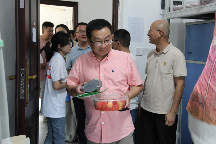 柴绪亮一行来到大田湾校区6栋、10栋等学生宿舍,仔细察看新生们的居住环境,给每个寝室送上水果拼盘与活性炭等慰问物资,并与新生及家长亲切交谈。“家是哪里的?”“对学校生活还适应吗?”“在学习和生活方面,有没有什么需求?”……在一问一答中,领导老师们倾听了新生的心声,了解了新生的诉求。