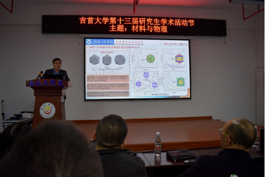 (李寻)11月28日上午,湖南工程学院计算科学与电子学院院长邓永和教授应邀参加我院承办的吉首大学第十三届研究生学术活动节“材料与物理”分论坛,并做学术报告。参与此次学术报告的有湖南财政经济学院副校长赵鹤平教授,怀化学院电气与信息工程学院院长米贤武教授、副院长黄利军博士,湖南科技学院付喜教授,我校研究生院副院长廖文虎教授,我院院长邓科教授,王小云教授等学院骨干教师及学院全体研究生。报告由学院副院长黄勇刚教授主持。