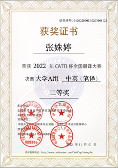 2022年10月31日,CATTI杯全国翻译大赛决赛成绩公布,我校外国语学院MTI教育中心2021级研究生张姝婷获全国总决赛大学A组笔译二等奖(指导老师:黄静)。该赛事从初赛、复赛到决赛历时8个月,分为大学组、职业组、外籍组、通用组,报名人数超过8.1万,参赛学校近1900所,创造了国内翻译比赛规模的新纪录。经过层层激烈角逐,我校MTI教育中心共三位研究生晋级决赛,其中王楠(指导老师:唐小田)、蒋安琪(指导老师:汤敬安)获复赛大学A组笔译三等奖。