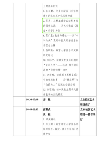 在研讨会上吴昊就自己的论文进行了宣讲,以其个人原创声乐作品《媚金·豹子》为研究对象,阐述通过运用三种基础曲式结构单位,结合湘西苗歌高腔音乐元素,实现对沈从文文学作品中音乐性再表达的研究过程,揭示在艺术歌曲体裁形式中实现技术性、文学性、艺术性三者有机统一的方式,得到了与会场专家和学者的好评。