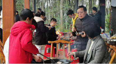 图为李洪雄书记正在品尝同学们的烧烤手艺