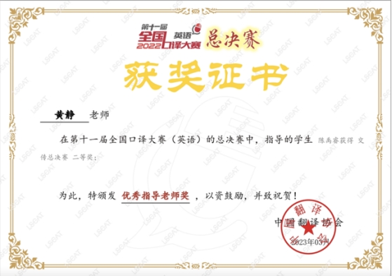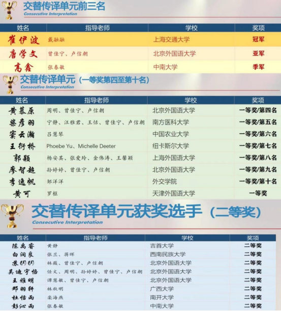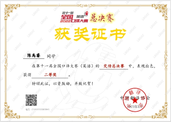 本网讯(通讯员黄静修伟)4月7日,第十一届全国口译大赛(英语)总决赛获奖名单公布,我校外国语学院2021级翻译硕士(MTI)研究生陈禹睿喜获全国总决赛交替传译组二等奖,获得目前我校在该项赛事的最好成绩,指导老师黄静获优秀指导老师奖。