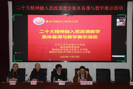 为了加强重点马院的对口协作工作和教学基层组织建设,切实贯彻落实党的二十大精神“三进”工作,不断提高思政课教师的教育教学能力,11月15日下午,吉首大学马克思主义学院联合湘西职院思政部、湖南医药学院和湖南应用技术学院的马克思主义学院举办二十大精神融入思政课教学集体备课与教学展示活动。四所高校马克思主义学院领导、概论课教研室主任及教师、德法教研室主任及教师参与本次会议。