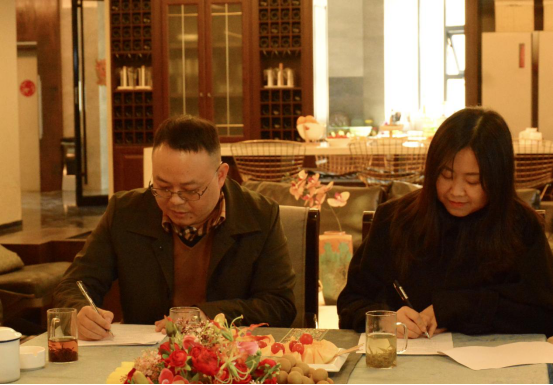 美术学院李婷婷副院长(右1)与湖南力禾设计工程有限公司法定代表人杨旭光(左1)签约