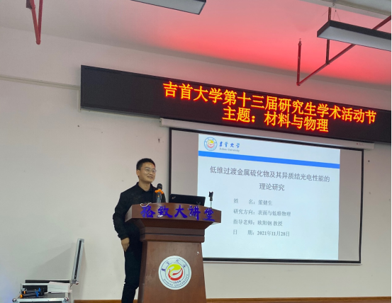 (李寻)11月28日上午,物理与机电工程学院青年教师董健生博士应邀参加吉首大学第十三届研究生学术活动节“材料与物理”青年博士论坛,并做学术报告。我校研究生院副院长廖文虎教授,学院院长邓科教授、在校物理学硕士研究生导师及学院全体研究生参与此次交流活动。报告由学院副院长黄勇刚教授主持。