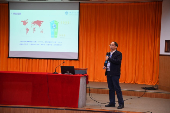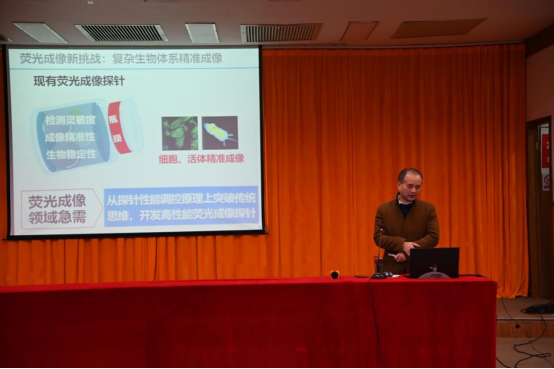 学术报告(一),由湖南大学化学化工学院院长、国家杰青张晓兵教授以“小分子荧光探针有序组装与原位生物成像”为题做了精彩的学术报告,介绍了小分子荧光探针在细胞中的成像、有机染料荧光探针的合成、小分子荧光探针在老鼠组织细胞的肿瘤筛查等内容,生动形象的阐述了荧光探针目前在肿瘤识别上的优点和不足。