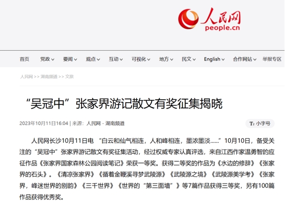 活动自2023年3月1日启动至9月28日止,历时半年之久,面向全国公开征集到描绘张家界武陵源景区(张家界国家森林公园)范围内的散文作品300余篇,参赛对象年龄最小者11岁,最大者70岁,自然来稿作者包括中国作家协会会员20位。经初选和复审,最终评选出一等奖1名,二等奖2名,三等奖7名,另有100篇作品获得优秀奖。
