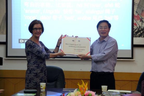 罗惠缙院长作总结发言。他对曹茜蕾教授精彩的讲演表示感谢,他还说这不仅仅是一次中西方语法的学习,更是一次中西方文化碰撞和交融的盛宴。最后,罗惠缙院长代表吉首大学文学与新闻传播学院聘请Hilary Chappell(曹茜蕾)教授为吉首大学文学与新闻传播学院的客座教授,并真诚的邀请曹教授日后给吉首大学莘莘学子带来更丰盛的文化盛宴。(文/宋林凤 摄/刘欣然)