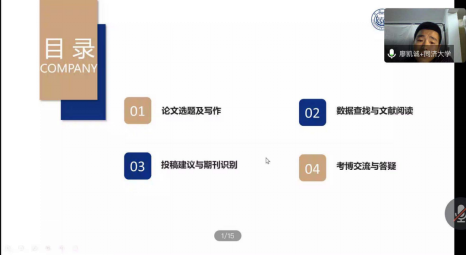 2020年11月17日晚7点,同济大学经济与管理学院博士廖凯诚受学院邀请进行了一场论文写作与投稿技巧分享讲座,本次讲座采用线上会议的方式,由商学院研究生办主任王振颐主持,商学院部分研究生参加。