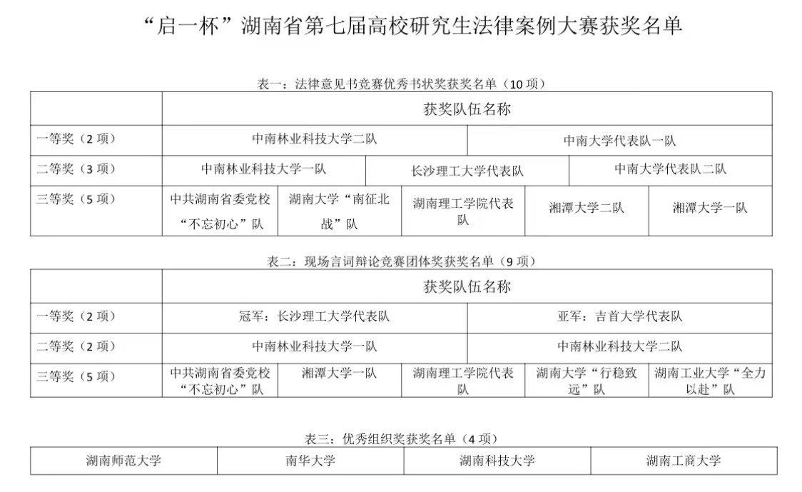 本网讯(宁超男)2023年4月15日至16日,为深入贯彻党的二十大精神,深学笃用习近平法治思想,切实提升研究生创新精神、科研水平和实践能力,推动省内法学院系之间的学术研究与人才培养交流,不断提高研究生培养质量,湖南省第七届高校研究生法律案例大赛在中南林业科技大学隆重举行。此次大赛,由湖南省教育厅主办,中南林业科技大学承办,中南林业科技大学政法学院、湖南启一律师事务所共同协办,大赛组委会办公室设在中南林业科技大学政法学院。