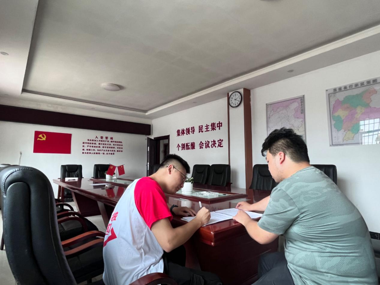 图为吉首大学研究生采访民乐镇党委书记黄海龙
