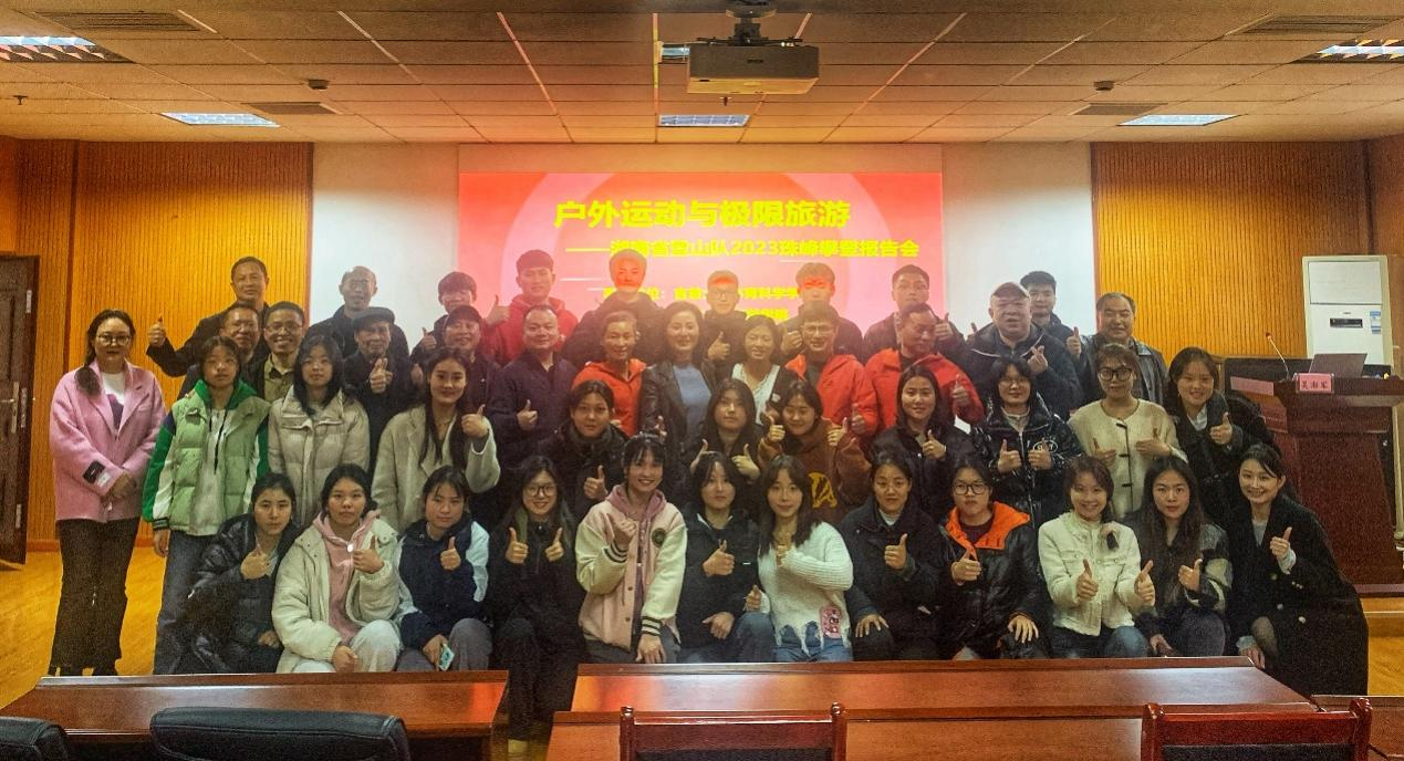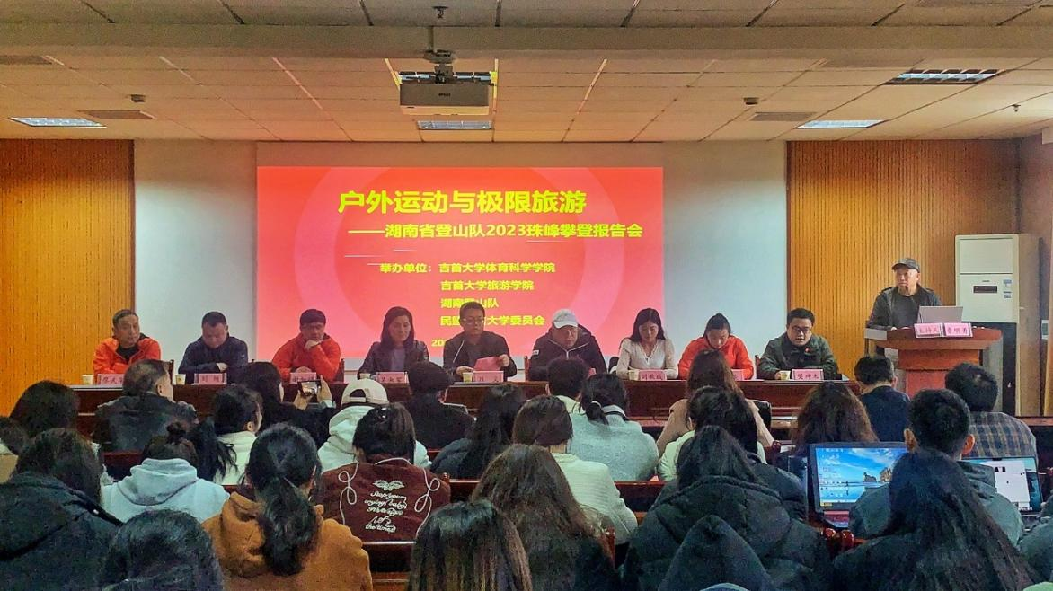 (通讯员罗湘豫 闫玲凤)为全面贯彻习近平新时代中国特色社会主义思想,深化研究生思想政治教育,落实一月一片一课一实践活动开展,提升体育学科研究生人才培养质量。2024年3月16日,由吉首大学体育科学学院、吉首大学旅游学院、湖南省登山队、民盟湘西州委员会联合举办的《户外运动与极限旅游——湖南省登山队2023珠峰攀登报告会》在体育科学学院“体育文化人培训培养重点基地”举行。出席此次报告会的领导、嘉宾有体育科学学院党委书记吴湘军教授、体育科学学院院长万义教授、旅游学院院长鲁明勇教授、湖南省登山队徐江雷、谢如祥、刘秋成、刘杨、阳燚、廖武军、湘西州民盟委员会秘书长樊神木以及部分教师和学生到会聆听报告。鲁明勇教授主持此次报告会。