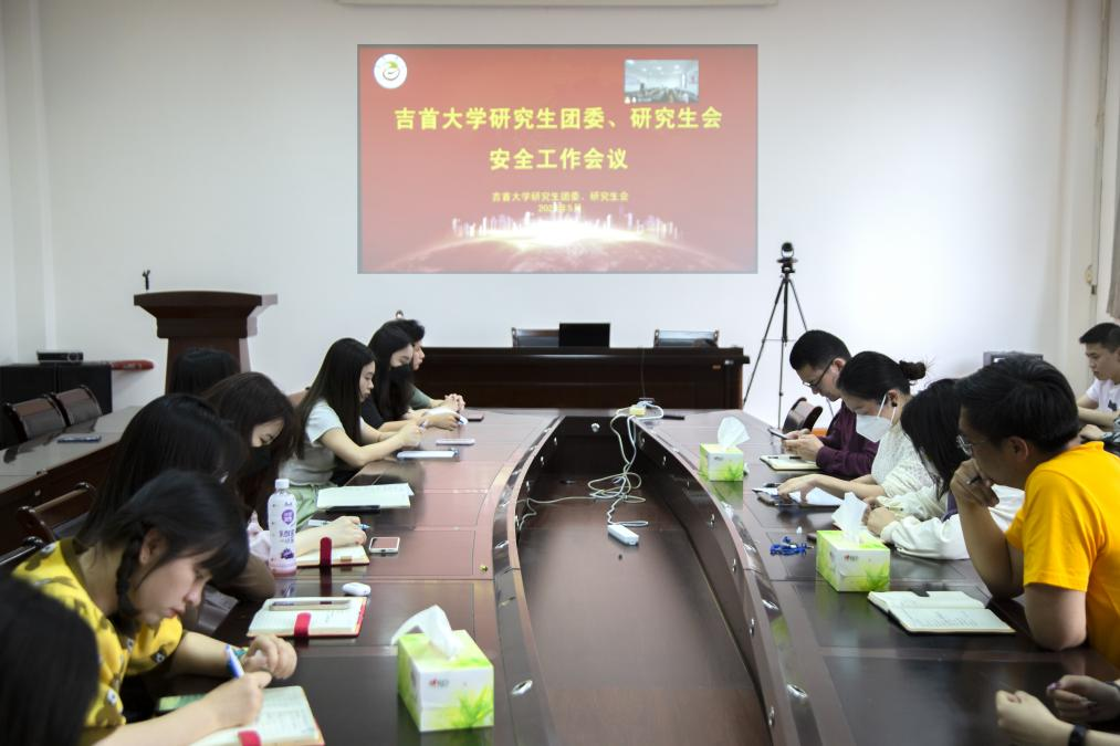 为进一步加强校园安全防范意识,提升校园安全管理水平,5月18日,吉首大学研究生团委、研究生会于研究生院二楼会议室召开安全工作会议。研究生院副院长肖宪平、教育管理科杨婵老师及研究生团委、研究生会全体成员参与了本次会议。会议由研究生会主席团执行主席康珏主持。
