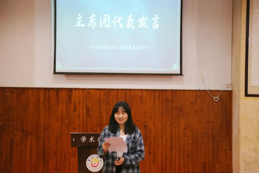 杨婵老师首先致辞,向即将踏上人生新征途的毕业生们表示了热烈的祝贺,在感谢大家这几年对于研究生团委、研究生会的付出的同时,也肯定了同学们敢于行动的实践精神,并希望毕业生干部们能以更加饱满的热情去挑战新的生活,收获更加闪亮的人生。