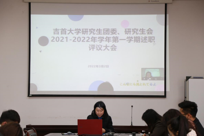 (通讯员/梁聪慧,摄影/廖惠)本网讯,为进一步深化研究生团委、研究生会的带头示范以及发挥广大研究生干部的桥梁和纽带作用。2022年3月2日中午12.:30,吉首大学研究生团委、研究生会2021——2022年学年第二学期述职评议大会于研究生会二楼会议室召开。研究生院学生管理科徐琪老师以及全体研究生会成员参加了此次述职评议大会。大会由执行主席黄雨婧支持,本次大会以“线下+线上”模式开展。