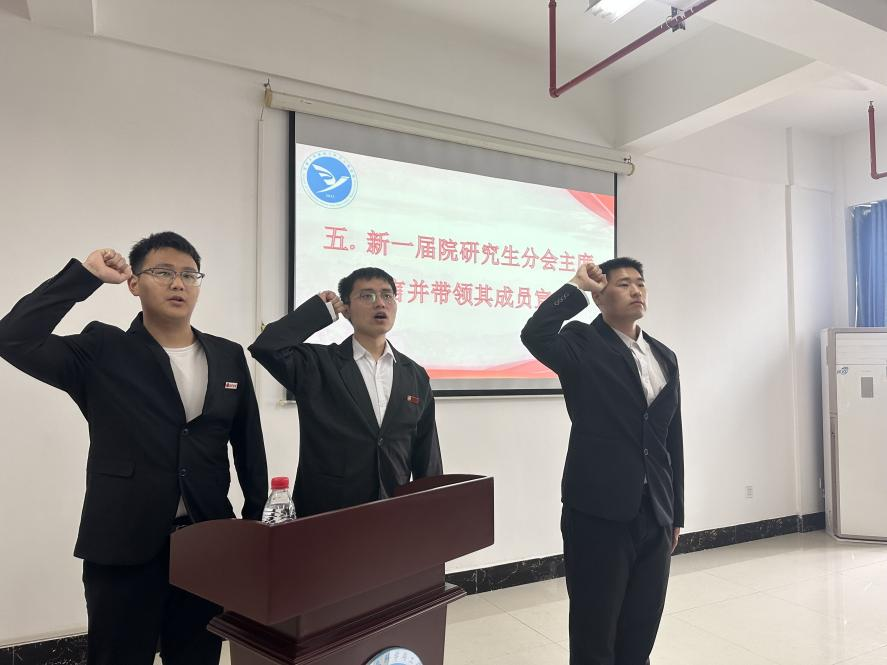接下来,由研究生院研究生会主席团成员康珏同学宣读了批复文件,正式宣布吉首大学通信与电子工程学院研究生分会的成立。随后,阳帅老师宣读了第一届院研究生分会主席团成员及各部门负责人。第一届院研究生会分会主席李昭贤同学在发言中表示,将全力以赴发挥研究生会分会的作用,积极服务广大研究生,并代表研究社分会全体成员向大家作工作汇报,发言结束后,主席团成员一同宣誓。